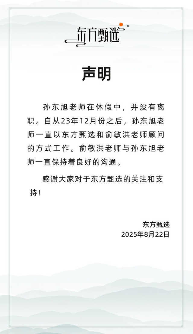8月22日,针对“东方甄选孙东旭或将离职”一事,@东方甄选 发文回应称:孙东旭老师在休假中,并没有离职。 自从23年12月份之后,孙东旭老师一直在以东方甄选和俞敏洪老师顾问的方式工作。